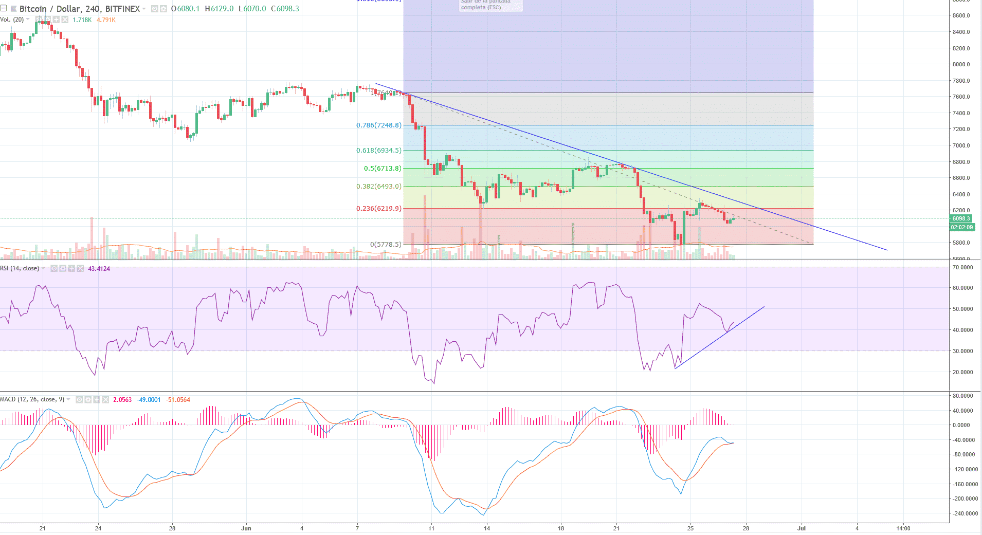 Los indicadores como el RSI nos están indicando una divergencia alcista que podría hacer llegar el precio a ese rango, sin embargo, el MACD se mueve por la parte baja de la línea y eso no es positivo si queremos estar dentro. Mi impresión es que puede llegar a la línea azul para luego corregir hasta los 5.750 para romper el triángulo en la gráfica intradía. Si eso ocurriera, podríamos estar ante un escenario tremendamente bajista.