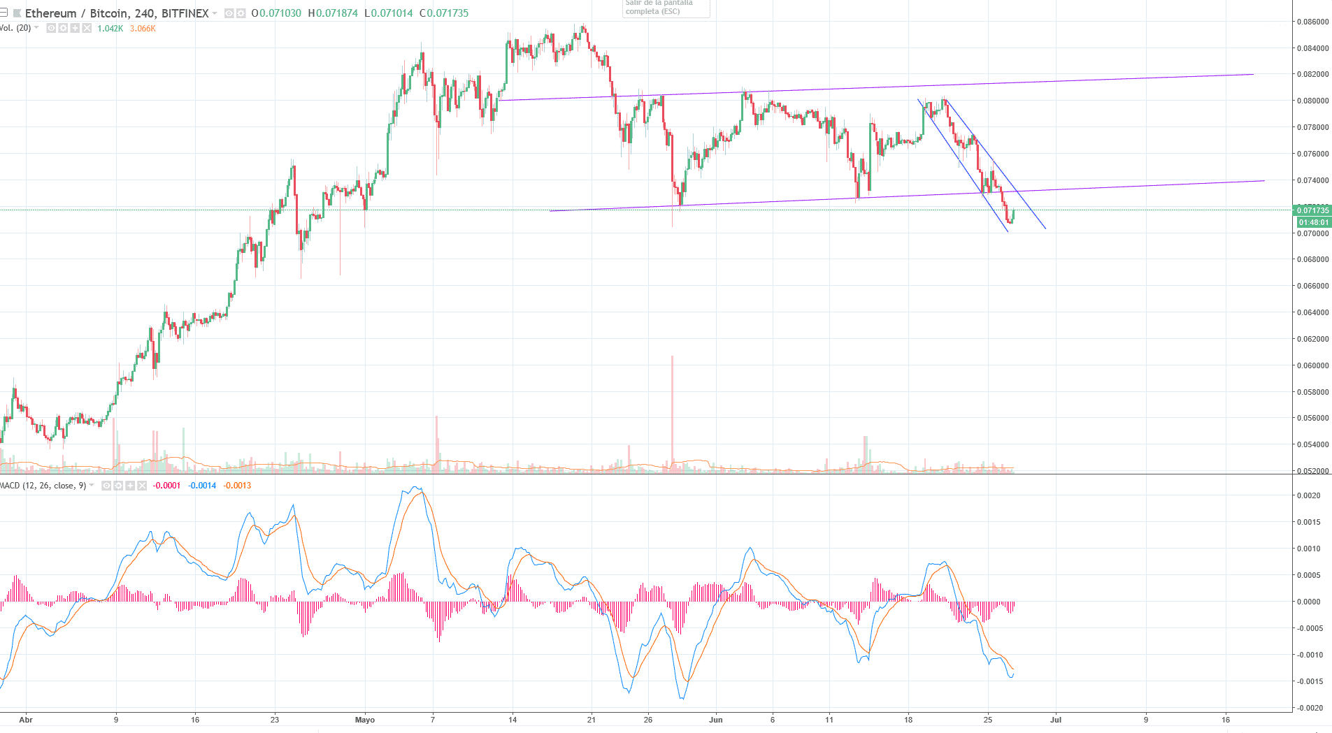 En cuanto a Ethereum, no recomiendo para nada una entrada ahora mismo, como se puede apreciar en la gráfica, el canal morado donde se estaba moviendo el precio con anterioridad ha sido roto, moviéndose actualmente por el canal azul, mantendremos nuestras posiciones hasta que veamos romper el canal azul y recuperar el soporte del canal morado. No creo ni que el precio intente hacer un movimiento de pullback hacia la línea morada, ya que el volumen de las velas es muy bajo.