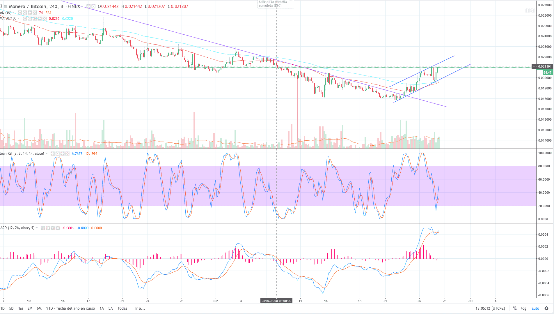 La criptomoneda basada en la privacidad más famosa está mostrando unos signos muy positivos, estamos hablando de Monero, actualmente moviéndose en un canal alcista y con unas velas verdes bastante elevadas, creo que el precio puede seguir el canal, los indicadores como el MACD nos invitan al optimismo ya que se está moviendo por encima de la línea, el estocástico tiene bastante espacio para escalar antes de situarse en sobrecompra. La EMA 50 y 100 están por debajo del precio, algo que implica un sentimiento bastante alcista y pueden servir como soporte ante una posible corrección.