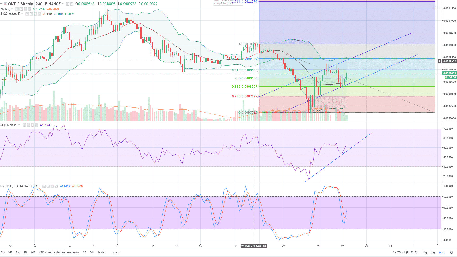 El AT nos muestra que ONT se está moviendo en un canal alcista, mientras lo mantenga será positivo, ahora mismo le veo una resistencia en el punto Fibonacci 38,2% desde su última caída, situado cerca de los 8.960 sathosis, el volumen de las velas está siendo bueno e invitan al optimismo, por su parte el RSI nos señala una divergencia alcista y el estocástico tiene mucho espacio para subir antes de situarse en sobrecompra. En resumen, Ontology está mostrando signos positivos y podría elevar su precio en los próximos días, en caso de caída, fijaremos los stop loss de seguridad por debajo de la línea inferior del canal alcista.