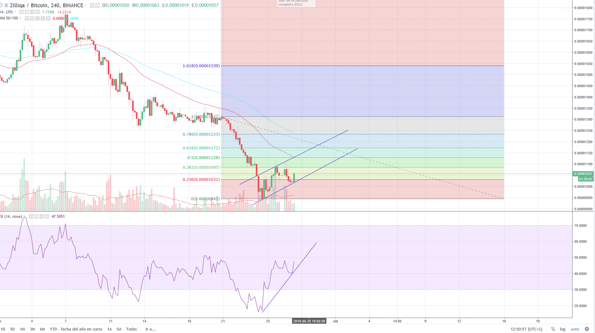 Aquí tenemos una de las criptomonedas que más han crecido en los últimos meses, Zilliqa está centrada en solucionar el problema de la escalabilidad utilizando la tecnología sharding. Para finales de Julio, está previsto el lanzamiento de su mainnet por lo que se avecinan buenos fundamentales para este gran proyecto. En la gráfica de 4H, estamos viendo al precio tomar un impulso alcista, acompañado de un buen volumen en las velas, el precio se está moviendo por encima de la línea intermedia de las bandas de bollinger, lo cual es positivo.
